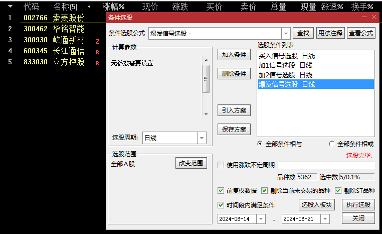 套装中包含的3个选股指标分别基于主图的红箭头信号、加1信号、加2信号及特定条件(如“钱袋子,爆发”信号)进行选股,帮助投资者快速筛选出符合条件的潜力股。