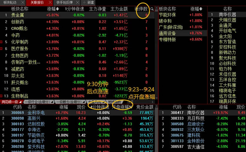 9:24分钟点击 开盘涨幅%,并且打开 竞价图,依次浏览高开个股,竞价图是否有涨停跌停试盘动作,股价保持高开状态,在竞价最后十几秒时是否有迅速拉升的动作,待9:25分钟时查看板块是否具备高开动作,与个股共振高开,副图 首板竞价的信号是2.反包是1.5数值。