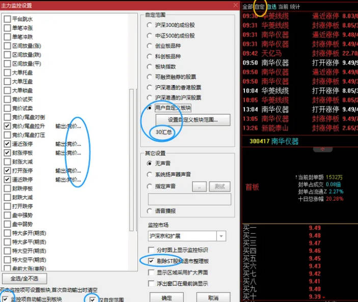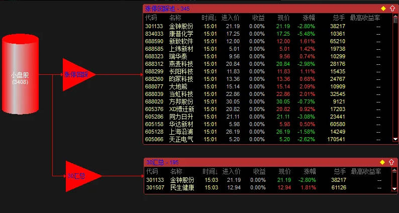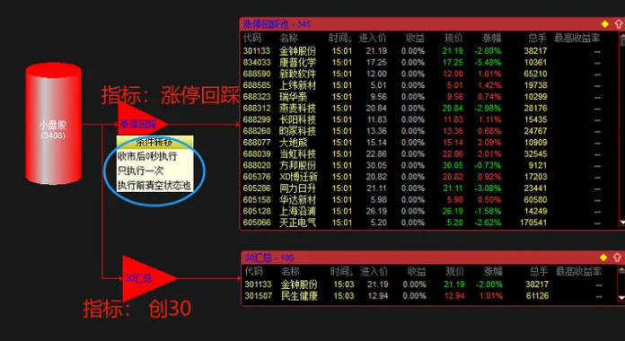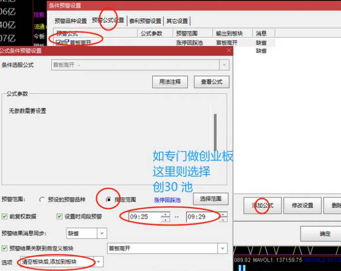 通达信版的比较容易,最好是用开心果版本的通达信,有股票策略池,自动入选到相关的自定板块池中,第二天只需盯盘即可,提前 新建自定板块:小盘股,涨停回踩池,创30池,首板高开池,竞价异动 池(竞价类型是涨停/跌停试盘,竞价拉升),下方图示编辑 的指标:创30 需改为 创20 指标。