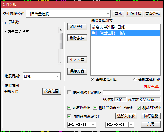 当日倍量:作为本指标的核心信号之一,“当日倍量”特指某只股票在某一交易日的成交量相较于前一交易日出现显著放大,达到或超过某一倍数(如两倍)。这一信号强烈暗示了市场对该股的关注度提升,可能是主力资金进场的直接表现。