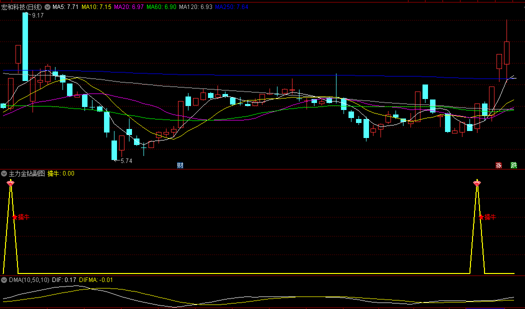 【主力金钻】指标简介:擒牛指标可盘中预警或盘后选股,如近期的“宏和科技、田中精机、逸豪新材”等,均出现了擒牛信号,可媲美金钻指标!找强启动股结合成交量和热点做删选。