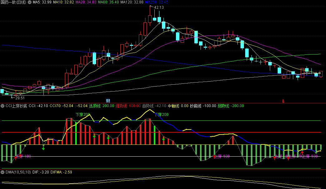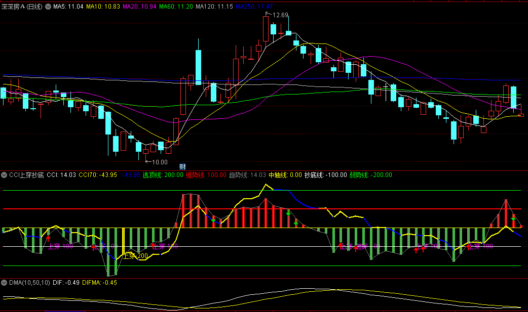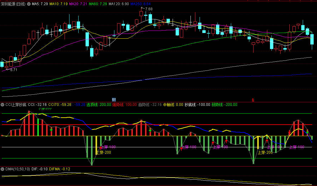 自己用的一个CCI上穿抄底副图指标,抄底有效性比较高,主要就是金叉原理,同时结合了CCI指标的一些经典用法,在处于极限的位置进场抄底!源码不含未来!