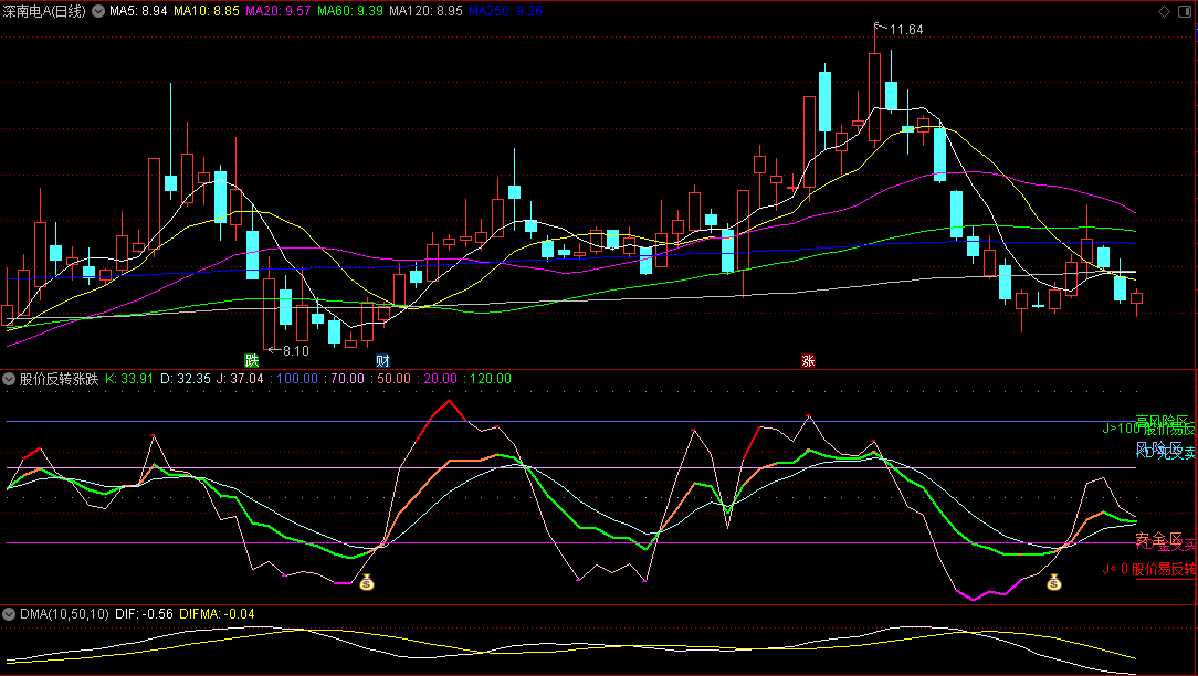 出现紫色粗线和钱袋子的时候,就是股价反转上涨,可以给予关注!