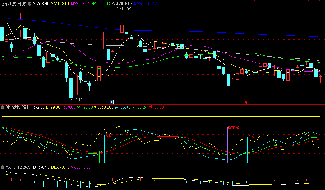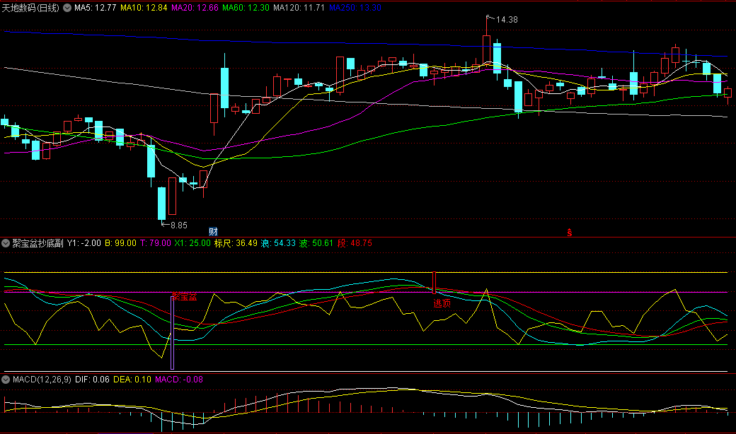 底部形态识别:该指标能够有效识别股价在下跌趋势中的底部整理阶段,特别是那些形态上类似于“聚宝盆”的构造,这种形态往往预示着股价即将结束下跌,进入反弹或反转行情。