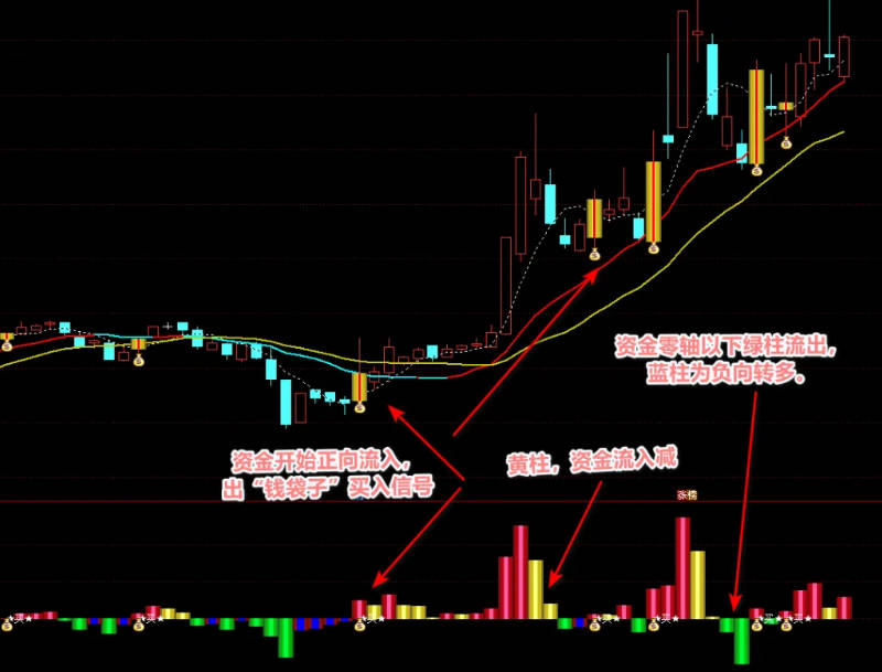 黄柱零轴向上:当资金流入速度放缓时,黄柱出现,提醒投资者需保持谨慎态度,观察后续资金流向变化,以防资金突然转向。