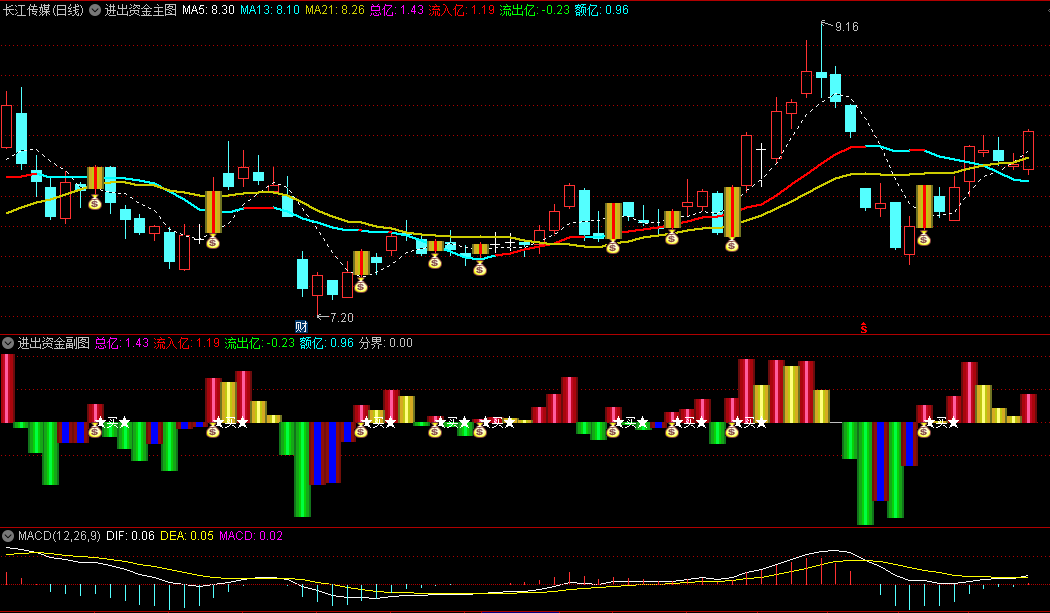 进出资金主图/副图/选股指标,精准追踪市场资金的流入流出情况,红柱零轴向上表明资金正在积极流入市场
