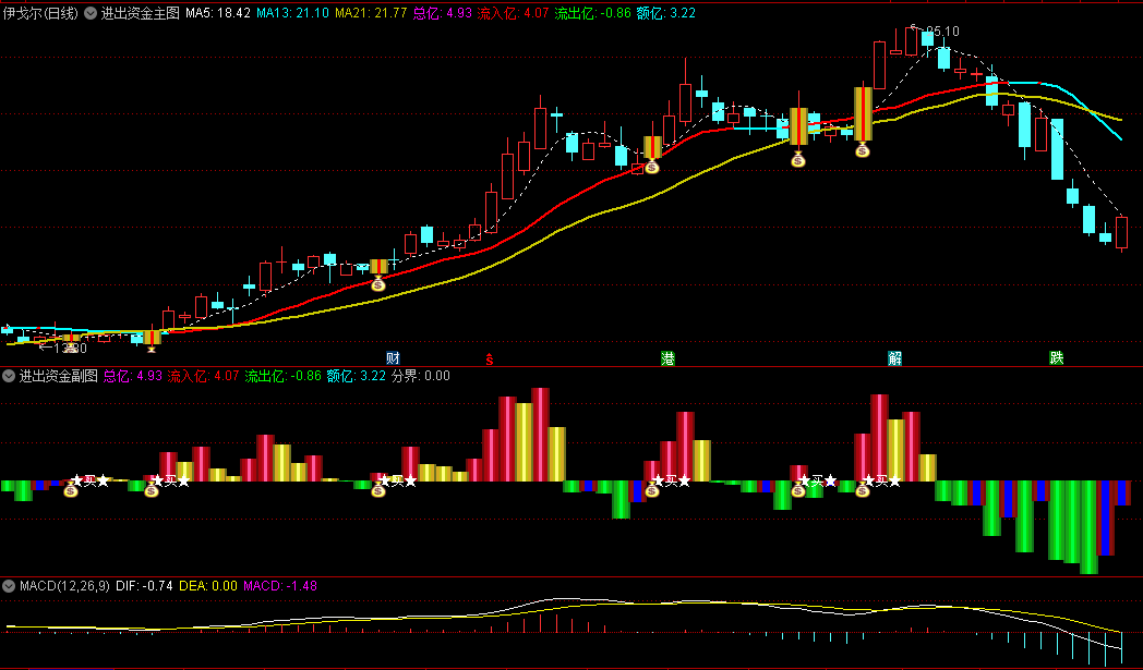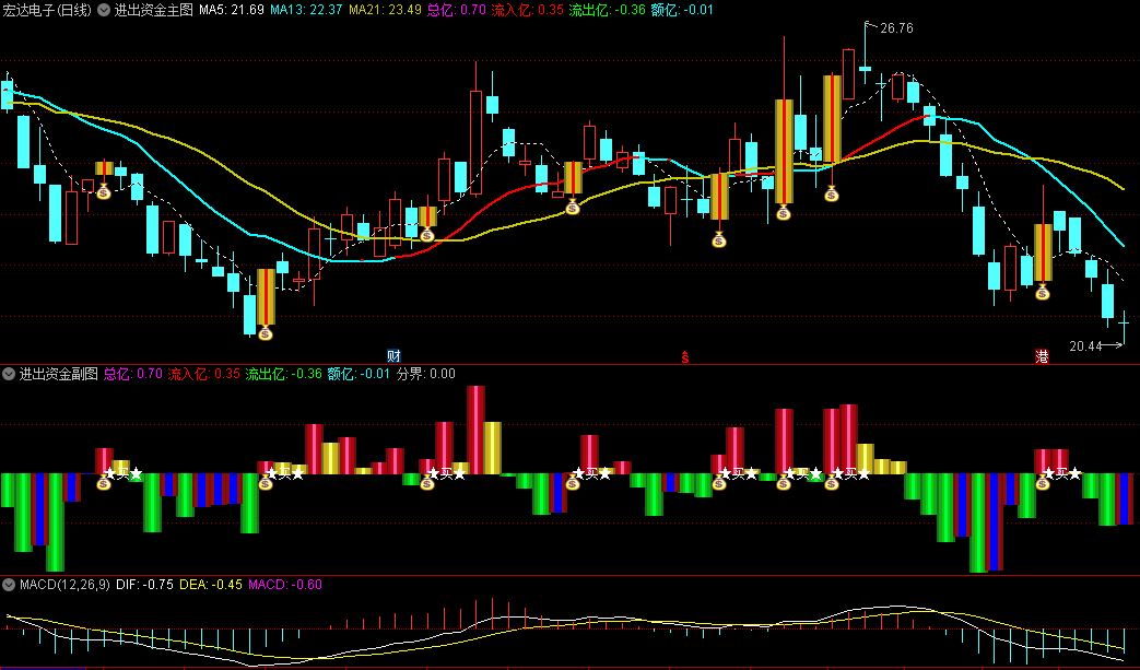 资金正向流入“钱袋子”信号:与副图红柱同步,主图上也会显示“钱袋子”信号,进一步确认资金正向流入的事实,此时投资者应高度关注,准备入场或加仓。