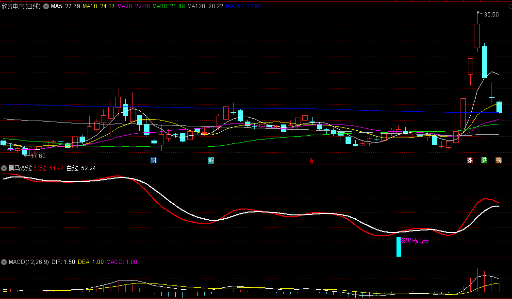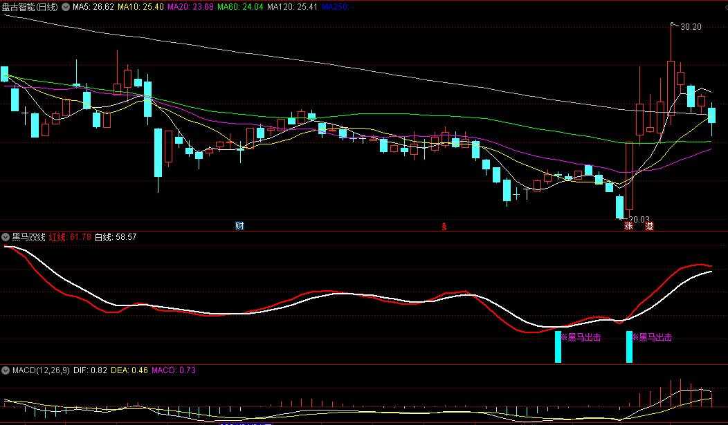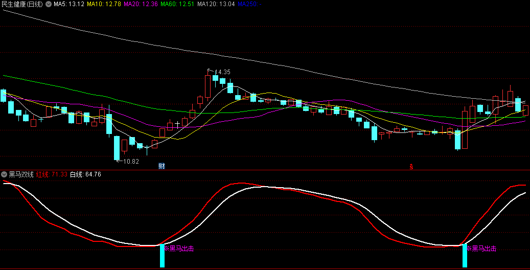兰柱出现:当双线金叉形成时,指标图上会出现兰柱,这进一步确认了黑马出击的信号,预示着阶段性底部的到来。
