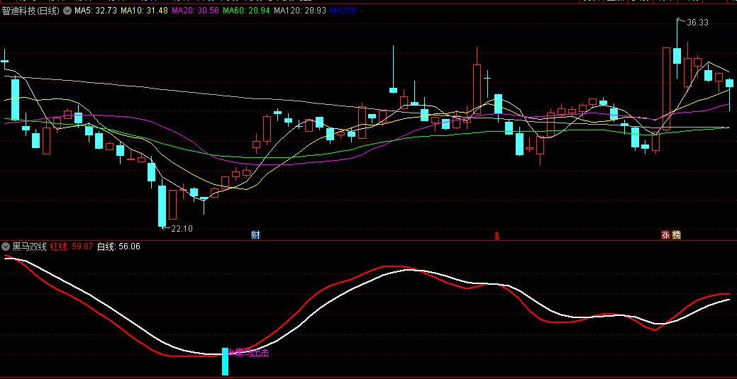黑马双线副图/选股指标,一种有效的抄底反转动能指标,捕捉阶段性底部的形成,提示适当的时机进行买入操作