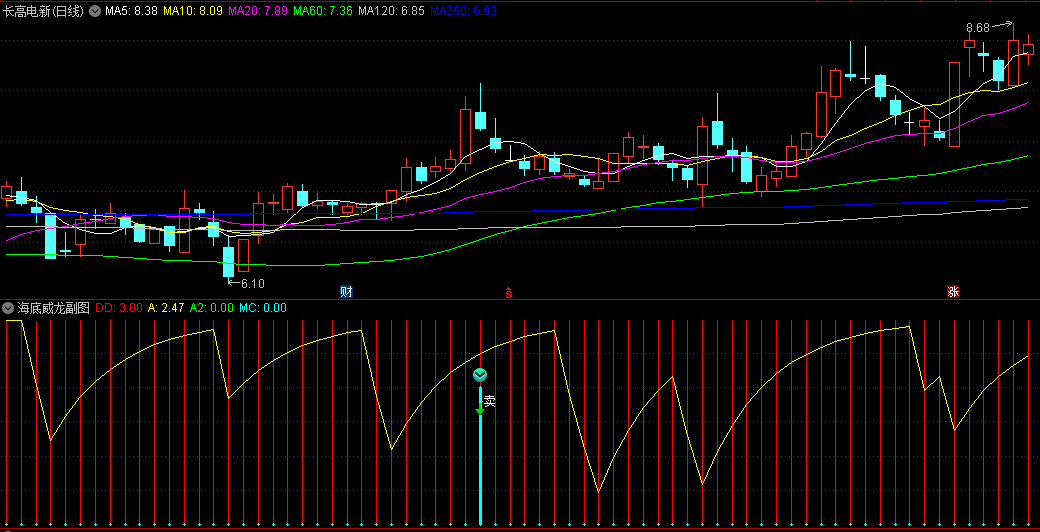 信号意义:当海底威龙副图指标中出现蓝色柱子时,这通常表示市场存在顶部风险。蓝色柱子可能预示着市场的上涨动力已经减弱或消失,且存在进一步下跌的风险。