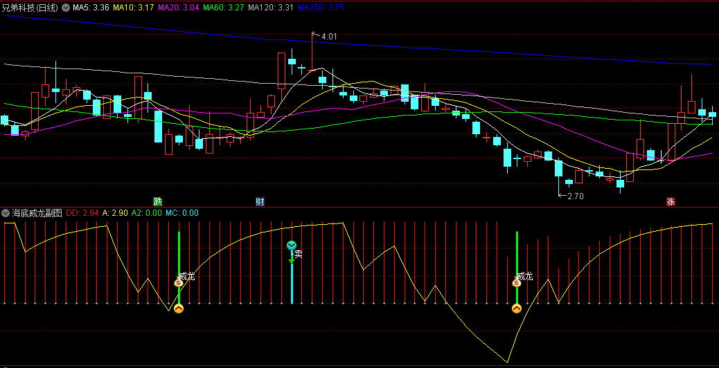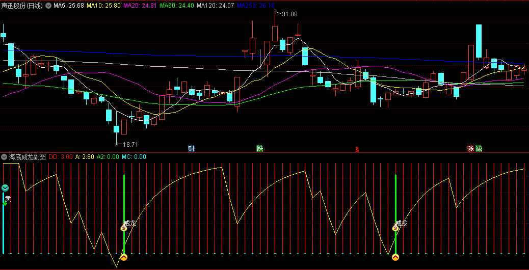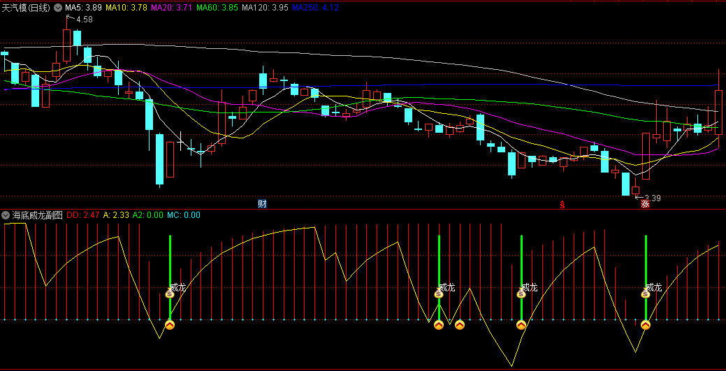海底威龙副图指标,基于均线和量能原理编写,判断市场动力强弱,把握股票的买卖时机