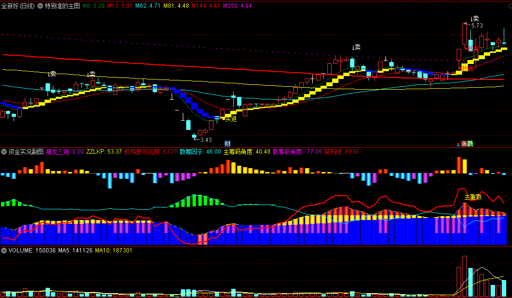 送给大家一个主图,是我刚刚在论坛的杂乱帖子里组合的,感觉里面的抄底信号比较实用。