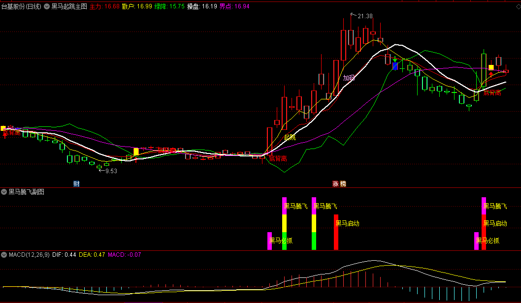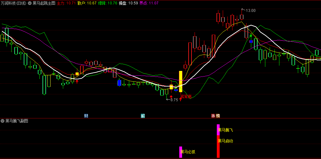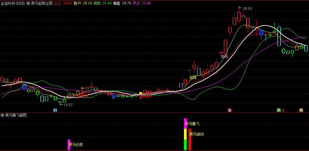 核心功能:聚焦于成交额分析,通过独特的算法模型,精准捕捉牛股启动前的资金异动,为投资者确认最佳入场时机。其中,“黑马腾飞”信号预示着个股即将进入高速上涨阶段,而“黑马启动”信号则明确标识了上涨行情的正式启动。