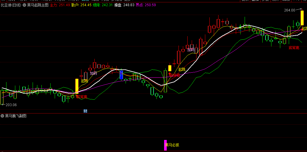 买点策略:当主图【黑马起跳】显示出底背离信号,将相关个股纳入观察池;随后,密切关注副图【黑马腾飞】指标,一旦出现“黑马腾飞”信号,需提高警惕;最终,当主图“起跳”信号与副图“黑马启动”信号同时出现,且股价已确立明确的上升趋势时,三指标共振,构成最佳买点,此时应果断入场。