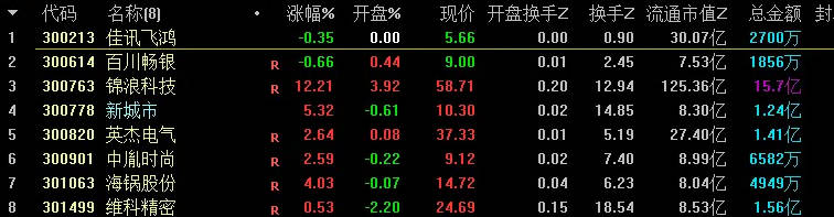 个股的一轮下跌,往往是一波高点越来越低的走势,将这些高点连线,会形成一条下降的趋势切线,如果某一天收盘股价站上这条趋势切线,可以视为转势。这个突破下降趋势的节点,第二天是个很好的试错买点。5000多只股票,难就难在第一时间发现这样的股票。这个指标能帮助你第一时间发现转势的个股。废话不多说,东西好不好,直接上图。2024年7月12日在创业板选出转势个股8支。