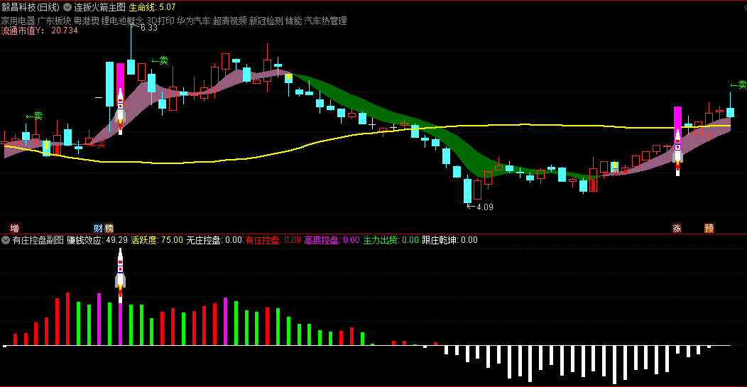 火箭信号:当主力雷达主图与跟庄王副图中同时出现“火箭”信号时,表明该股票当前处于强势上涨阶段,且受到主力资金的积极推动,是投资者应重点关注的标的。