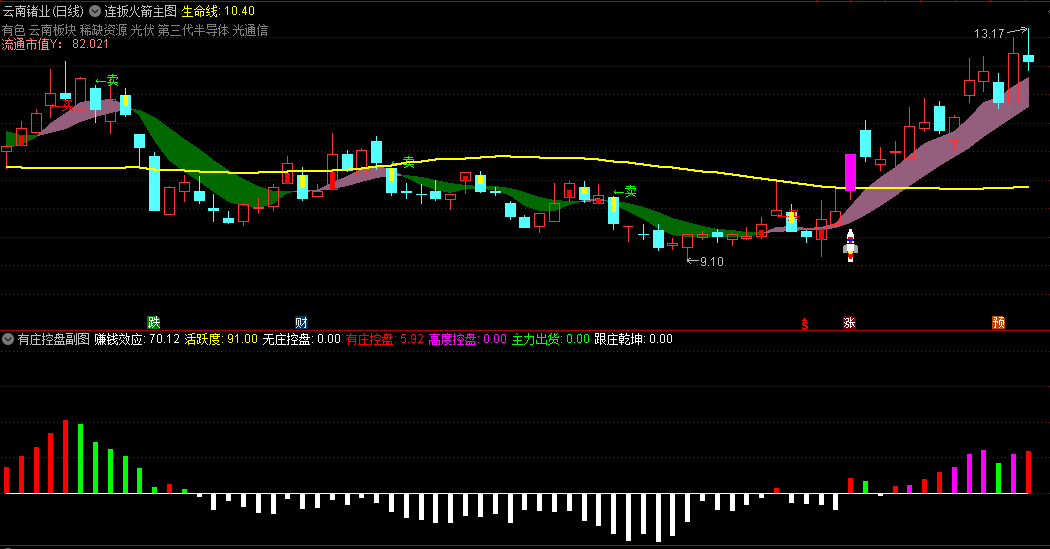 粉色色带:在主力雷达主图中,粉色色带代表波段持有区域,即股价处于相对稳定的上涨通道中,投资者可持股待涨。