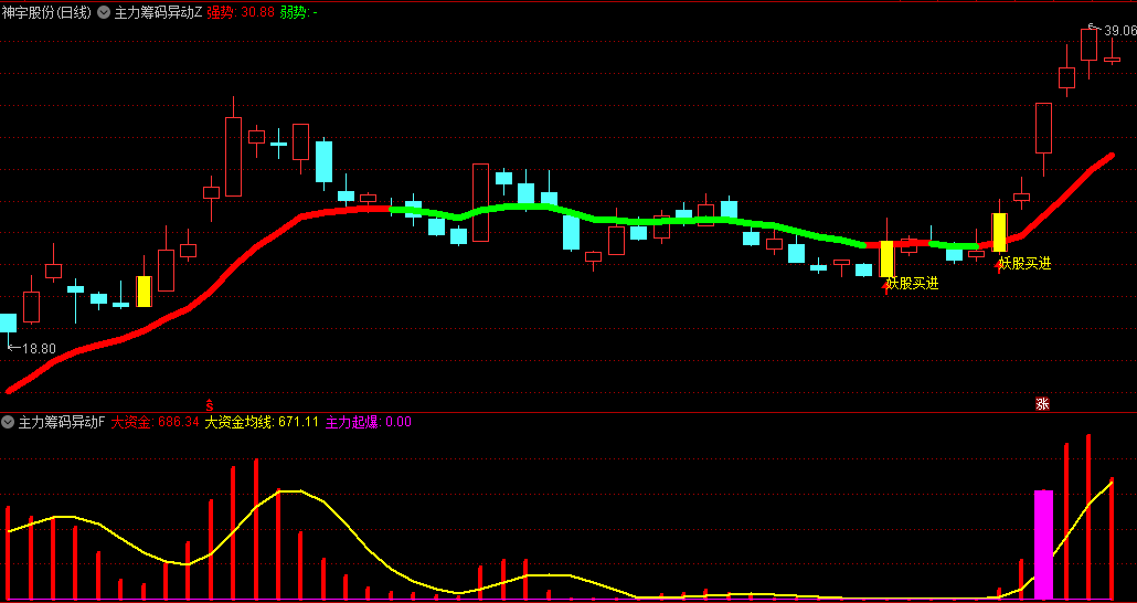 〖主力筹码量能异动跟庄擒龙〗主图/副图指标 超级强趋势类指标 一条趋势线打天下 通达信 源码