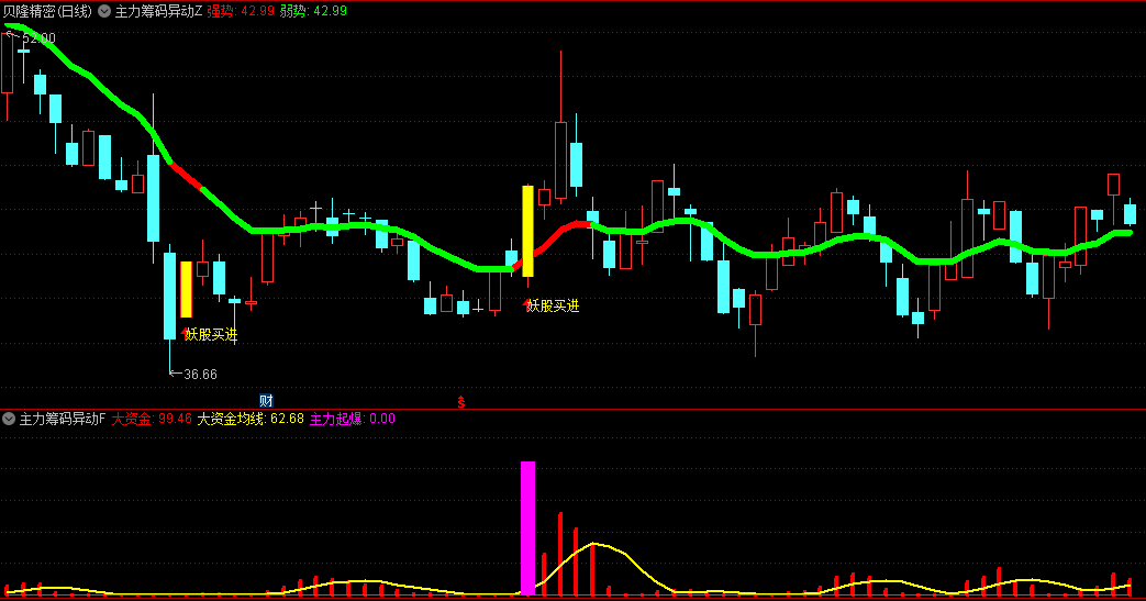 主图指标“妖股买进”超级强趋势类指标,一条趋势线打天下,趋势线为绿色代表空头行情,趋势线为红色代表多头行情。