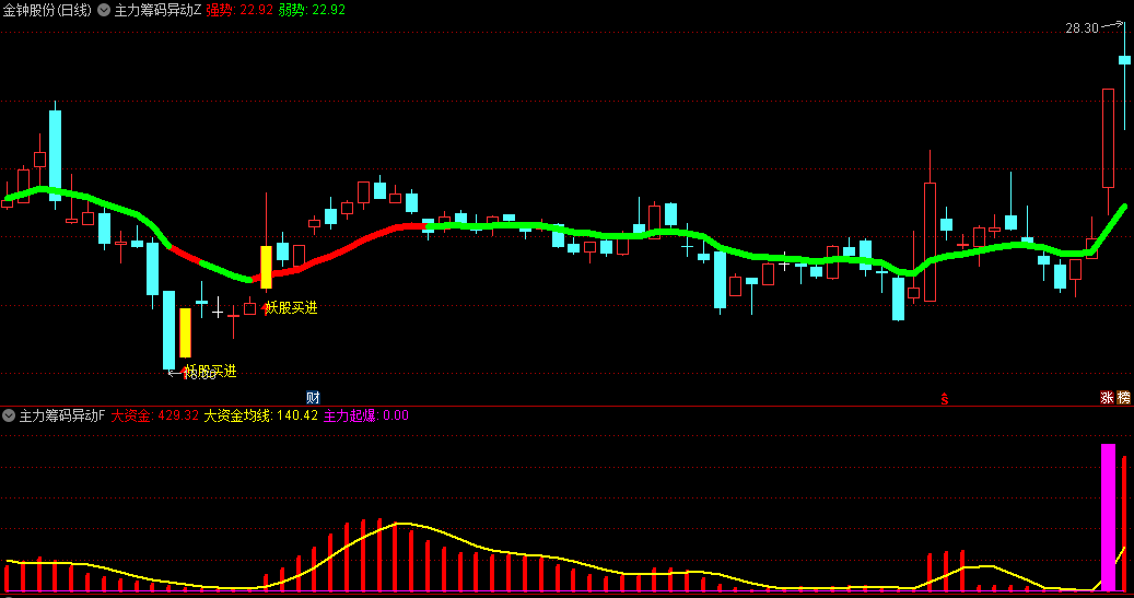 副图指标“筹码量能爆发”成交额类指标,紫柱越宽说明筹码换手越充分,如果是底部则预示游资大规模吸筹。