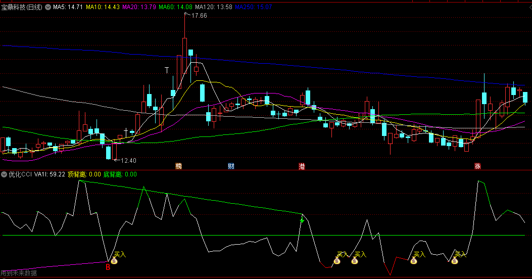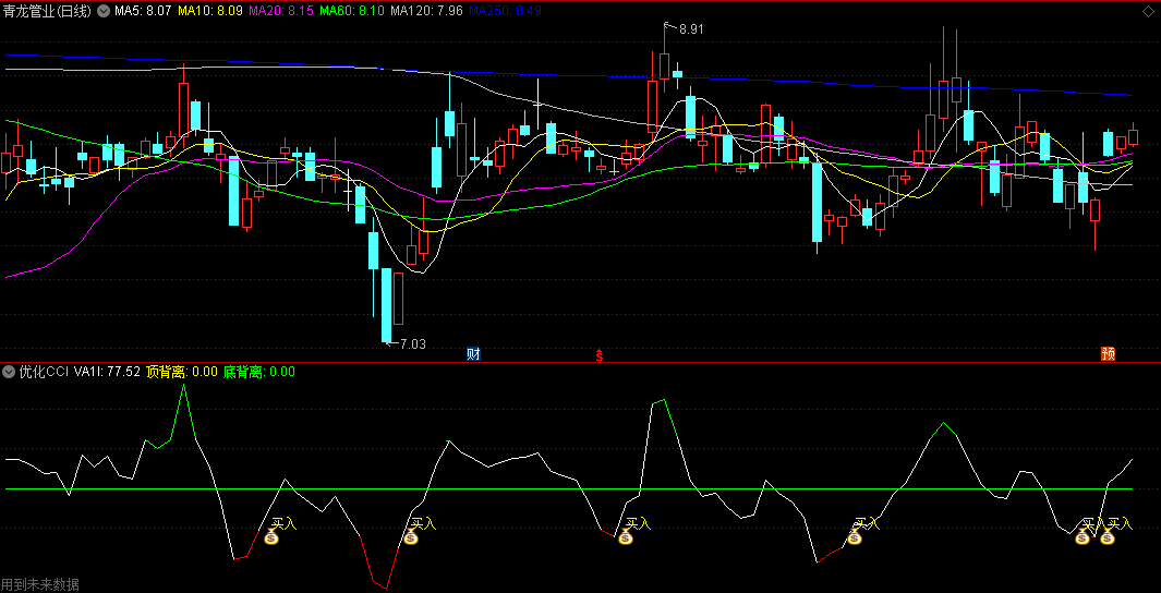 优化CCI副图指标:底部出现信号后站稳当日的最高价考虑分批买入,(图中已标注),顶部出现绿箭头分批卖出,利润大小自己把握;该公式包含未来函数:BACKSET和DRAWLINE。