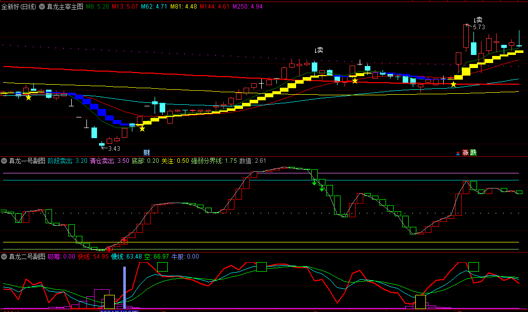 “真龙主宰”这是一个主图公式是集买卖点趋势于一体的主图公式,由黑马王主图公式改进过来的。主要是由六条线、两条趋势带、两个买卖点组成,六条线分别是8日均线、13日线均线、62日均线、81日均线、144日均线、250日线,这六条线分别代表不同的含义,每条线都是特定的。