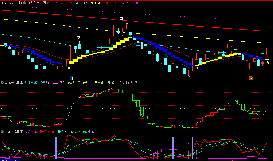 真龙二号主要是帮助大家把握主力资金的建仓的情况,这个比较简单,有两条线和一个吸筹标志。吸筹标志为紫色标志,这个标志一般出现在一个下跌过程或震荡整理的时候,一波上涨的前期,根据吸筹标志的大小判断主力吸筹的量的多少,吸筹越多越大,行情要越大,当一波吸筹近尾声时,如果伴随着快线上穿慢线形成金叉是最佳的买点,这个也可以参考真龙一号的买点相结合,高位达到快线下穿慢线形成死叉,就是卖点,结合真龙一号卖点提示。