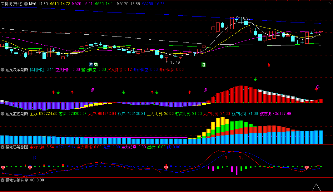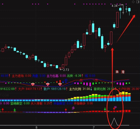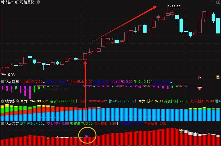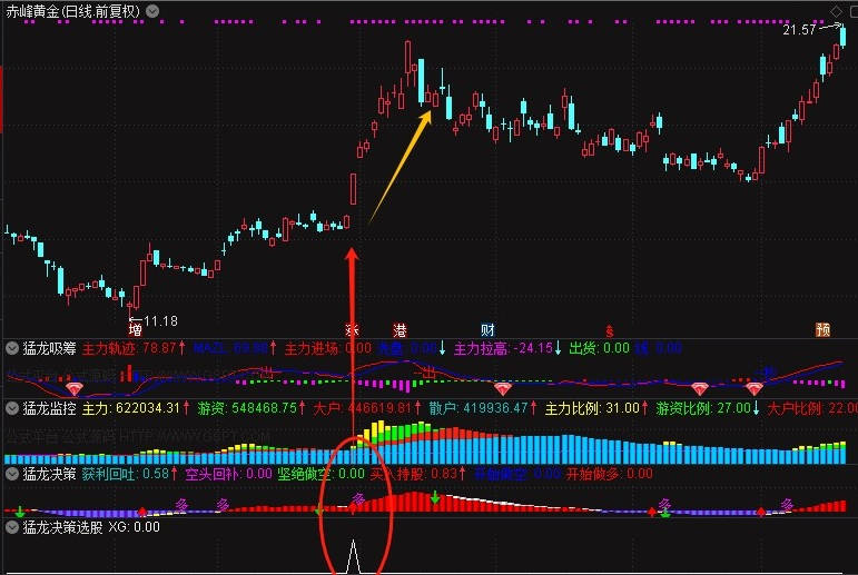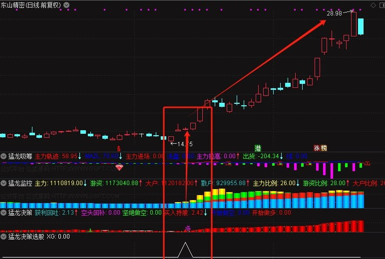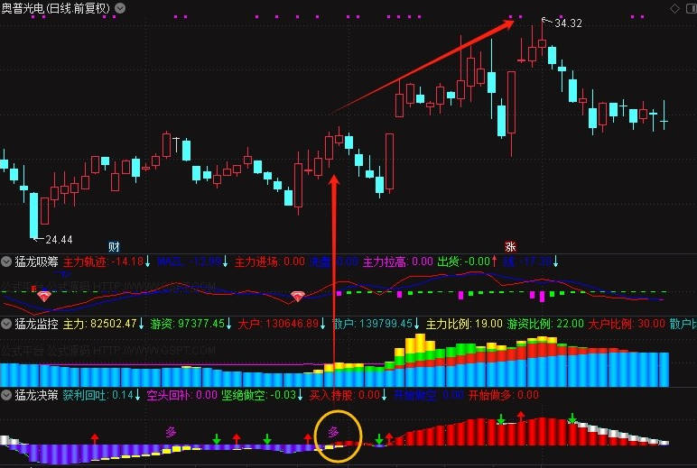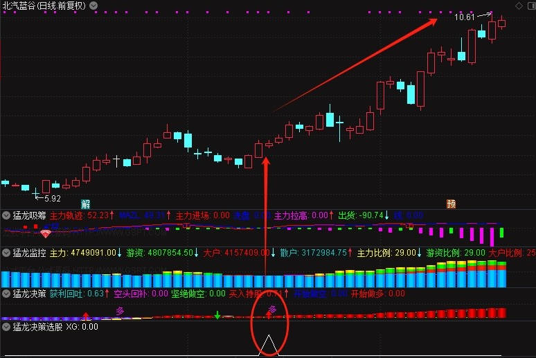3、猛龙决策:此指标幅图主要看,出现红色柱子或开始出现多字,代表股价在逐步上升。在红色区域出现由空变多时,趋势更为明显,可复盘多只个股进行验证。
