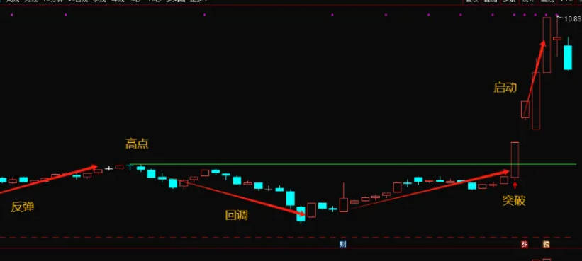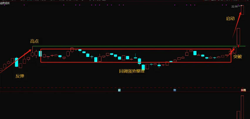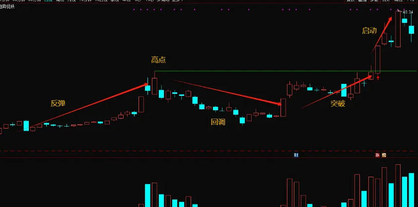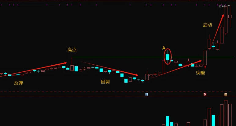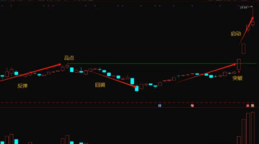 绿色的水平虚线,是反弹过程中产生的最高点,如果这个最高点被突破,往往是启动的信号;