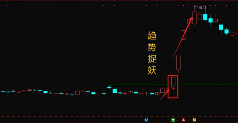 在第一轮反弹的过程中,创出一个高点,这个高点,在4月29号突破,也就是图中的红色箭头的位置突破,突破之后,开启了连板的大妖股走势;