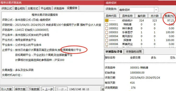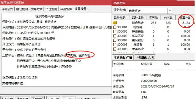 这里我们评测的周期是从4月份开始的,因为我们用到了日期,只是针对目前创业板的实际情况来量化的,评测的买入价是按照当天的中间价买进的,因为我们是采用预警的方式,评测系统没有给我们预警价格买入这个选项,所以折中的选择采用中间价开仓,平仓采用次日开盘价就平仓,也就说,无脑的买进,次日无脑的卖出,不用考虑的情况下,胜率81%;