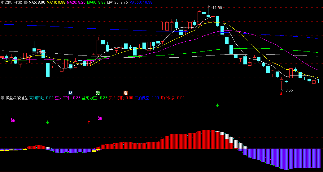 主图趋势判断:首先,利用强龙操盘主图判断整体趋势。确保股价位于主力成本线或操盘线之上,这表示市场处于强势区域,有利于多头操作。