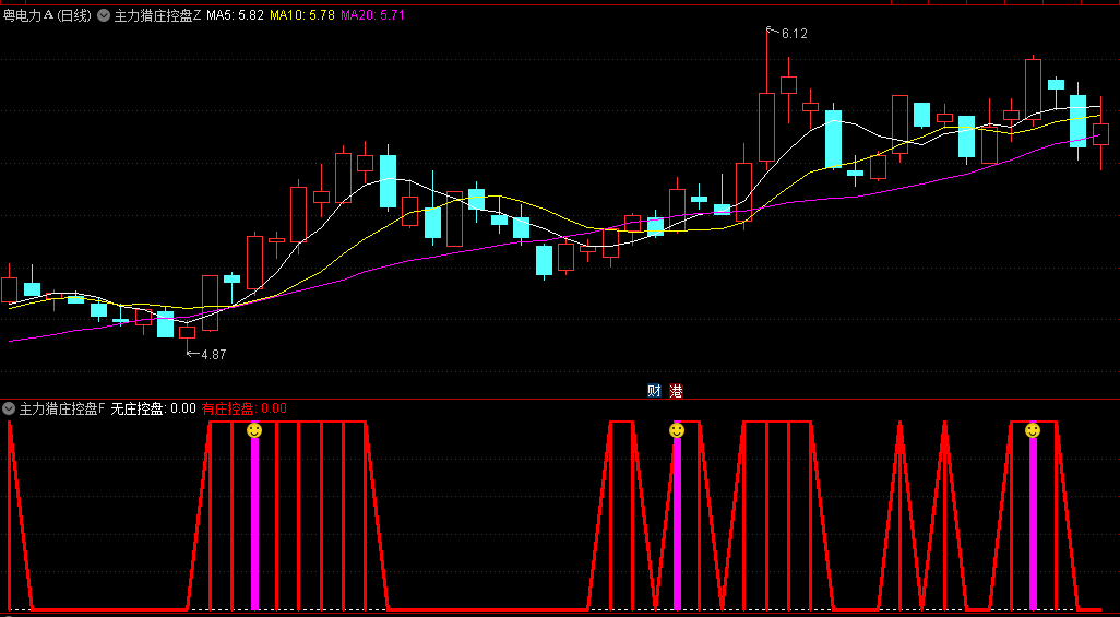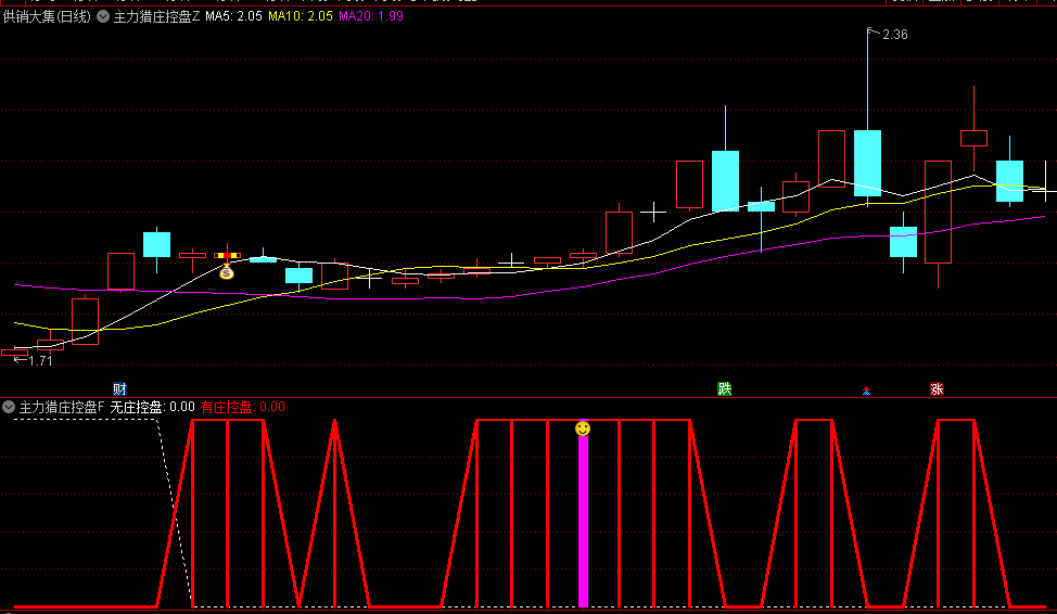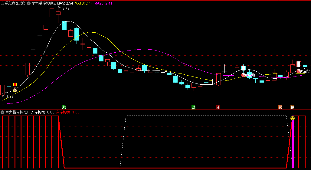 笑脸信号:副图中的“笑脸”是一个组合信号,它结合了金叉和有庄控盘两个条件。金叉通常指的是短期均线(如5日均线)上穿长期均线(如10日均线),是市场趋势转强的信号。而当金叉与有庄控盘同时出现时,便形成了“笑脸”信号,这进一步强化了买入的可靠性。因为这意味着不仅市场趋势在向好,而且背后还有主力资金的支持。