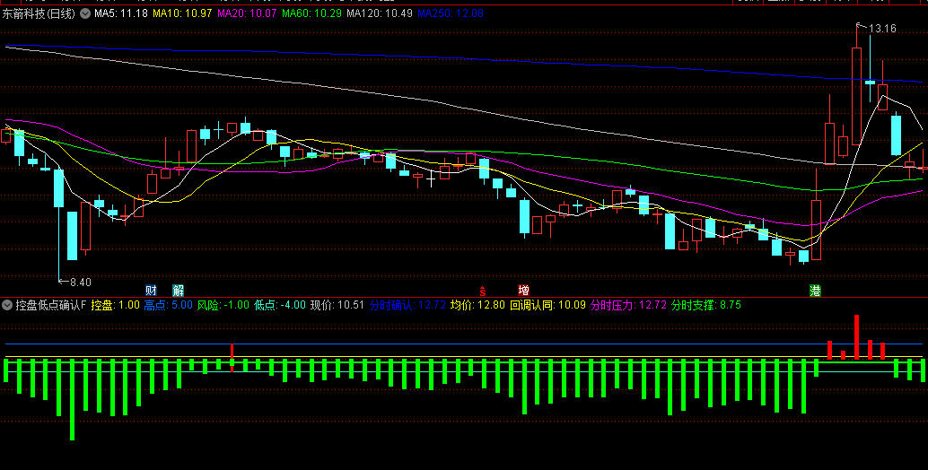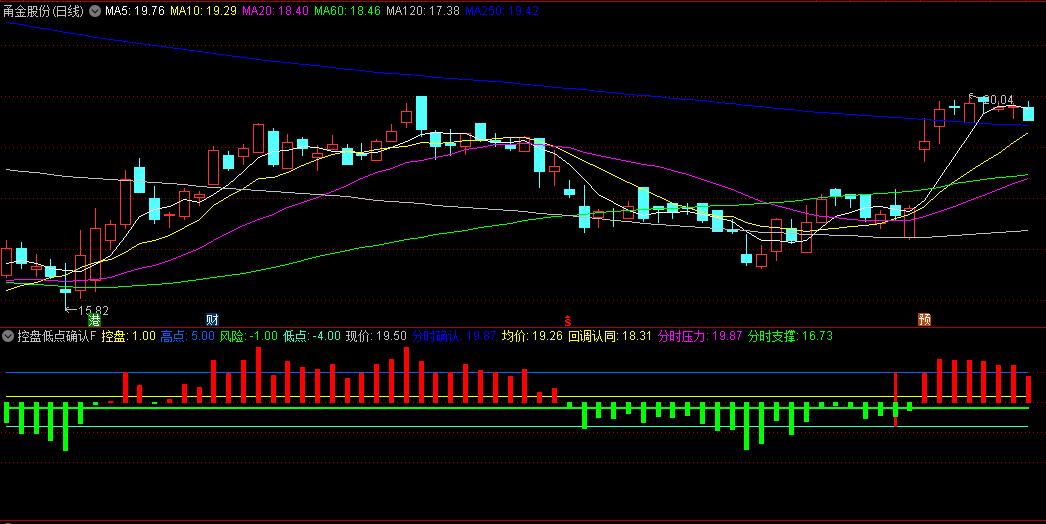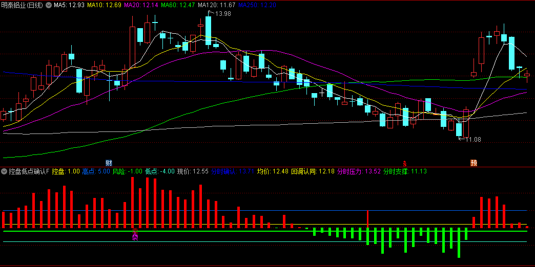 控盘低点确认副图指标,绿色栅栏上面出现第一根红柱子,是低点确认的信号!