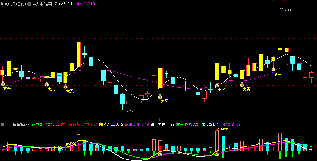 副图是量能指标,确定趋势反转之时的量能结构,量能柱由绿变红,且出现“抢筹”信号,代表量价共振行情。