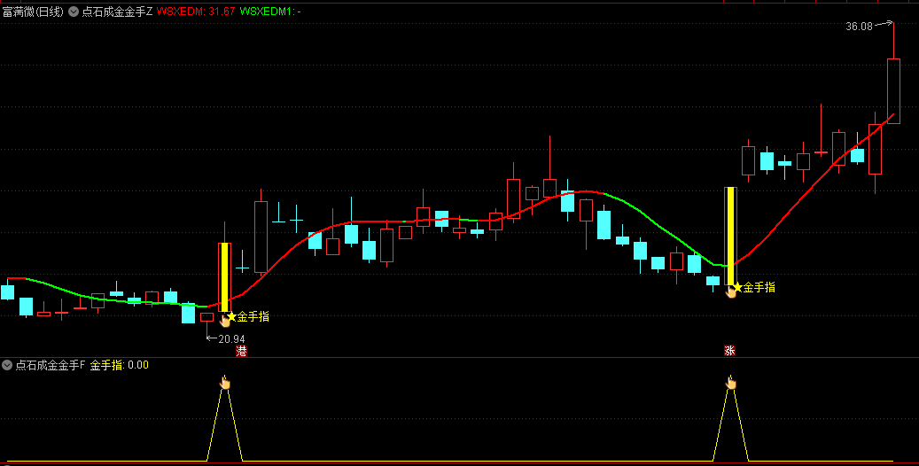 点石成金金手指主图/副图/选股指标,采用60日赫尔均线作为趋势判断依据,金手指出现红色均线上,将现一波上涨行情