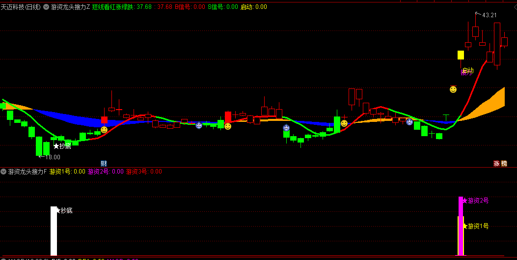 【游资龙头接力擒龙】套装指标包含:龙头连扳主升主图+游资点火副图+龙头抄底副图+笑脸信号选股+抄底信号选股;