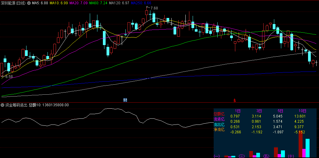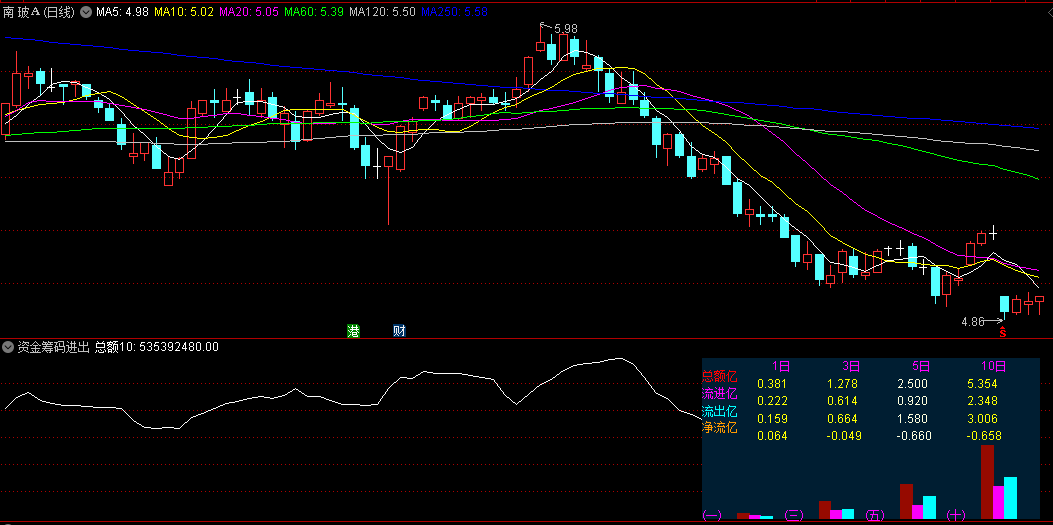 资金筹码进出副图指标是一种重要的技术分析工具,它通过展示资金总额曲线和柱状线,直观地反映了1日、3日、5日、10日等不同时间周期内的资金流进出情况。