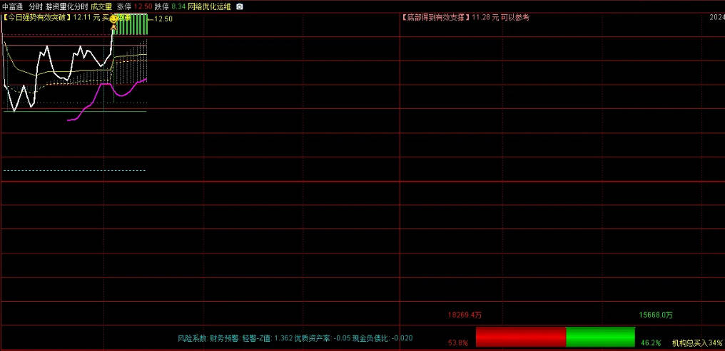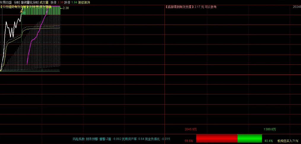 指标说明:一款量化分时指标,包含入场位提示,统计机构和散户的买卖占比等信息,分析散户和机构的买卖力道,帮助投资者判断个股目前是由机构主导还是散户主导。同时,还可以确定突破买入的价位,帮助您把握买入后的上涨概率。规避财务风险:在大规模退市行情之下,财务风险成了散户投资者最大的风险。指标通过系统化的财务分析功能,帮助投资者识别个股的财务风险,从而规避投资风向。此指标电脑端使用效果更好。