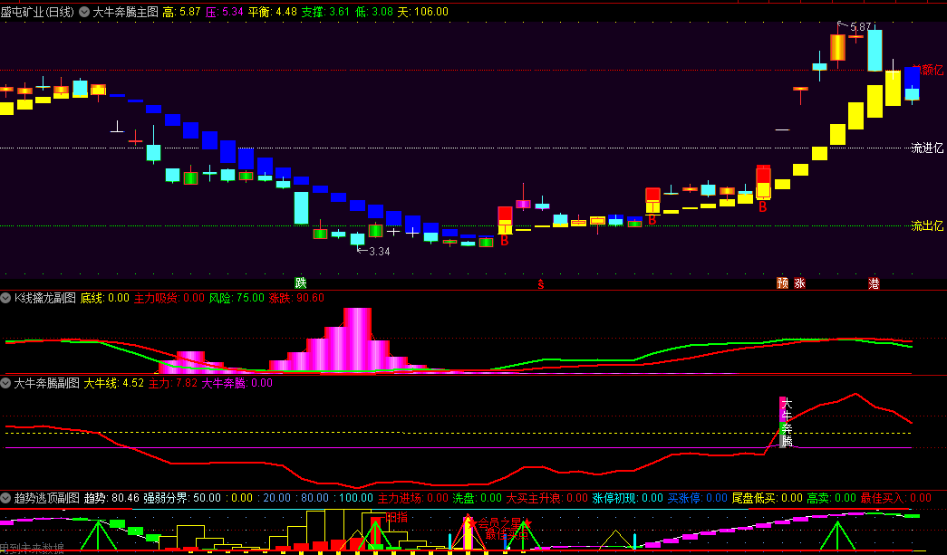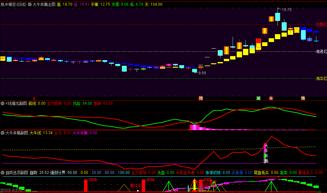 大牛奔腾与趋势跟随:当附图明确显示“大牛奔腾”信号,且主图趋势线保持黄色时,投资者可积极跟进,顺势而为。