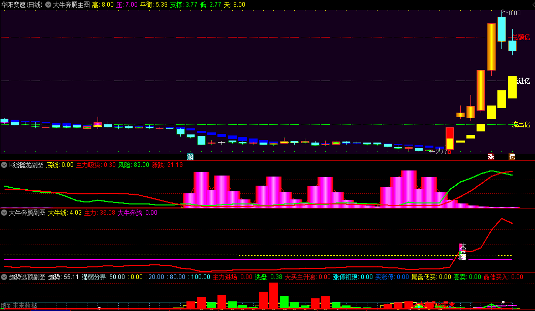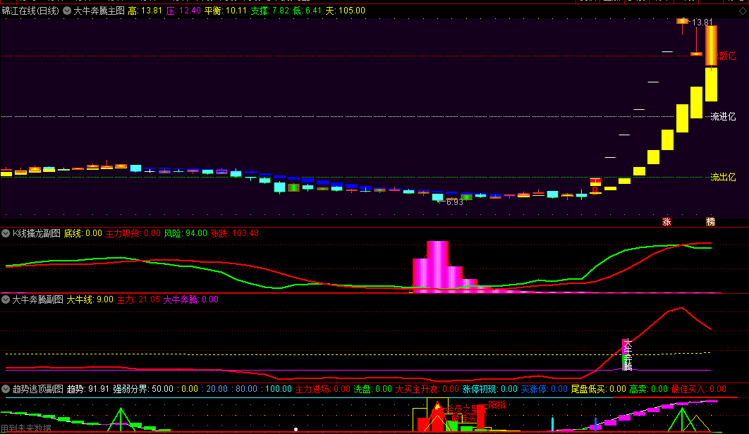 精选〖大牛奔腾抓大牛〗主图/副图/选股指标,附送k线擒龙副图+趋势逃顶副图指标,抓股价迅猛攀升强势股!