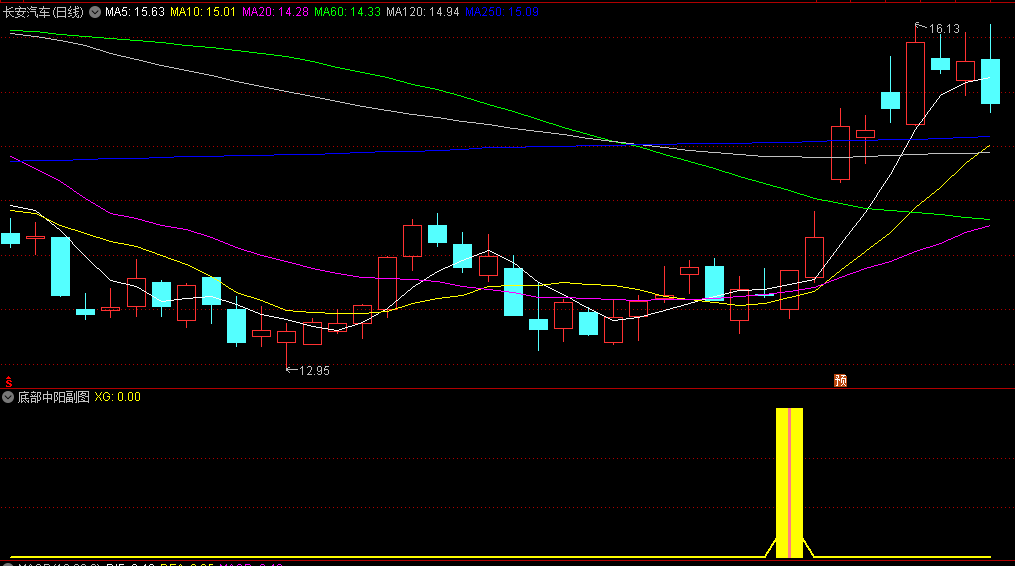 识别信号:当市场处于相对低位时,密切关注本指标在副图上的表现。一旦指标发出明确的信号,表明底部中阳线已经形成,即可视为买入的良机。
