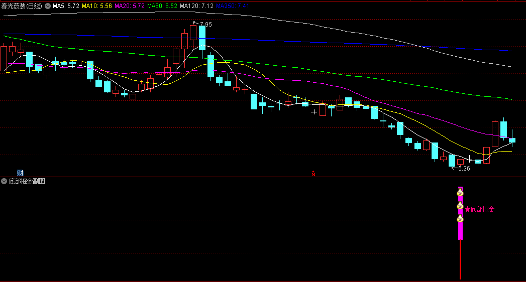底部掘金副图/选股指标,识别三段下跌、放量上涨、缩量调整及转折K线等一系列市场信号,在市场底部精准定位具有潜力牛股