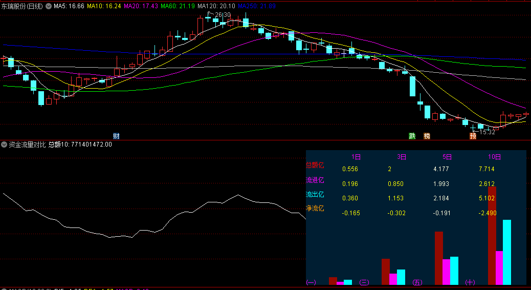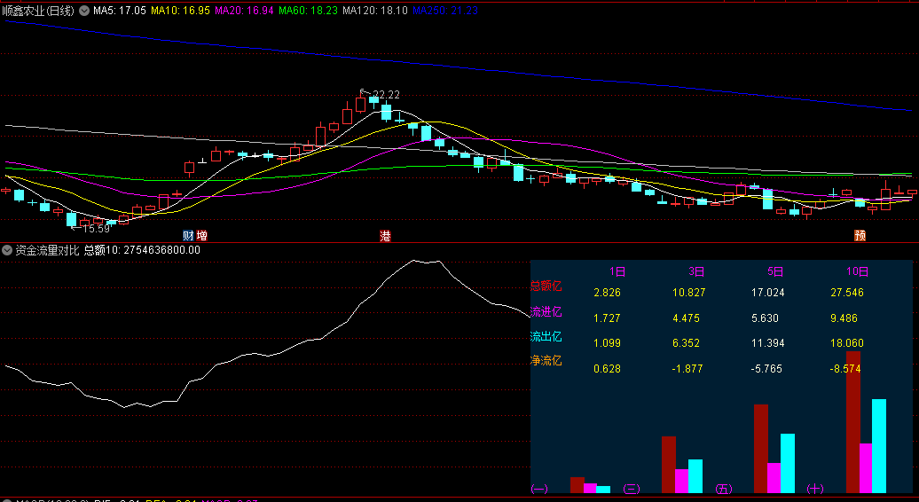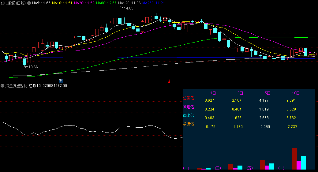 指标介绍:指标由资金总额曲线和柱状线组成,直观的显示1、3、5、10日的资金流进出情况,对持股、底部吸筹起飞的判断,起到重要的辅助作用。