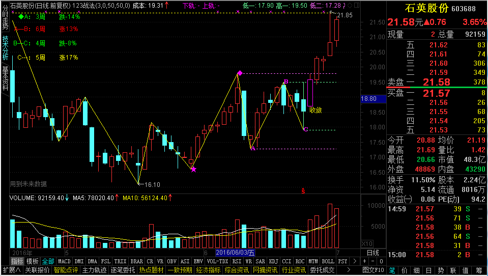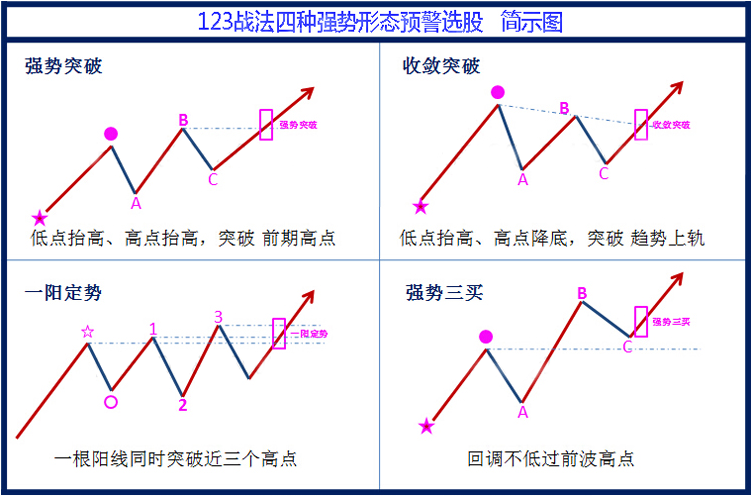 缠论123战法:综合了趋势理论、道氏理论、波浪理论、 缠论等常用的形态结构分析战法。运用通达信特有的画线函数画出波段高低点线段,直观显示K线的形态结构便于投资分析决策。运用独特的函数算法,求出波段高低点的值进行排列对比,从而实现各种形态选股条件。