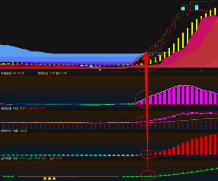 通达信【趋势共振系列】套装指标,色彩变化主图+趋势特征副图+强势起爆副图+共振追涨副图+金牛现身副图,跟随趋势抓大牛!
