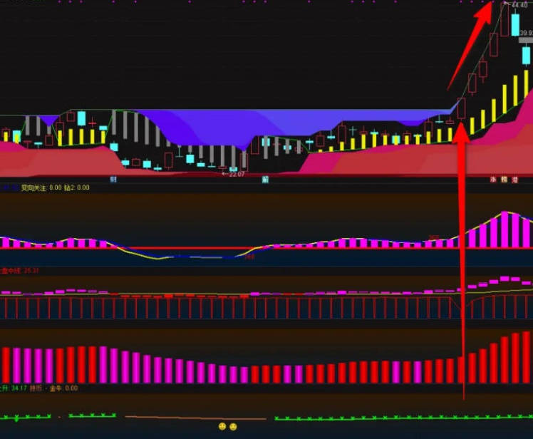 2、蓝色系色块几乎没有,只见红色系色块,同时出现黄色柱体,恭喜你发现一支大妖股,