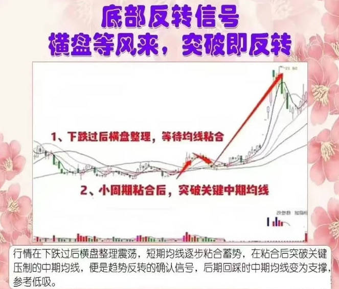 2、横盘等风来,突破即反转:行情在下跌过后横盘整理震荡,短期均线逐步粘合蓄势,在粘合后突破关键压制的中期均线,便是趋势反转的确认信号,后期回踩时中期均线变为支撑,参考低吸。