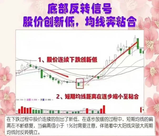 3、股价创新低,均线奔粘合:在下跌过程中股价连续的创出了新低,在逐步放缓的过程中,短期均线的偏离在不断修复,当偏离值小于1%时需要注意,伴随着中大阳线突破大周期均线时反转确立。
