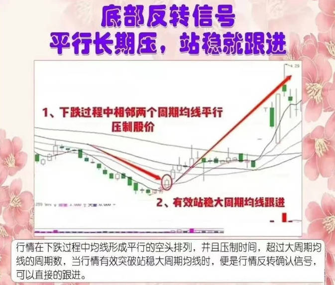 5、平行长期压,站稳就跟进:行情在下跌过程中均线形成平行的空头排列,并且压制时间,超过大周期均线的周期数,当行情有效突破站稳大周期均线时,便是行情反转确认信号,可以直接的跟进。